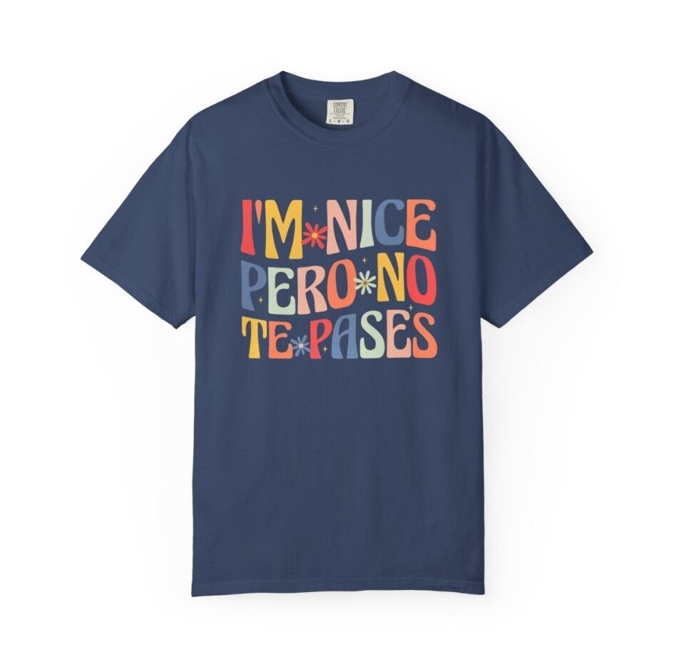A unisex garment-dyed T-shirt with the phrase 'Im Nice Pero No Te pases' for those who want to add a touch of humor and personality to their wardrobe. This tee is perfect for casual wear and can be styled for various occasions, making it a great addition for those looking to express themselves through their clothing. Ideal for adults looking for a comfortable, versatile piece that stands out.