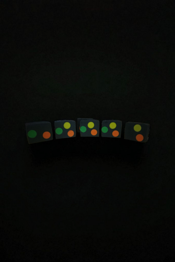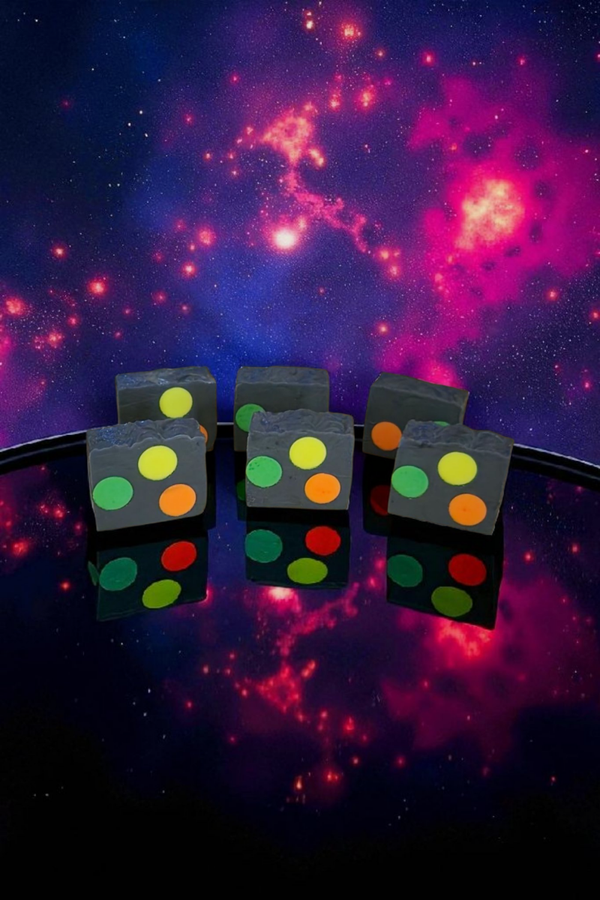 Each bar features glow-in-the-dark neon circles, reminiscent of glowing planets and moons, and is topped with a sprinkle of biodegradable glitter for a starry-night effect.