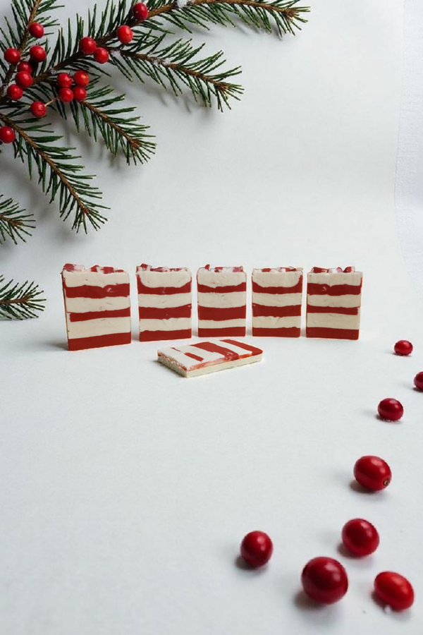 Bring holiday cheer to your bath with this candy cane themed festive red and white striped soap, designed to look just like a candy cane. Made with a skin-loving blend of coconut oil, olive oil, shea butter, and vegetable shortening, each bar creates a creamy, moisturizing lather. Enriched with sodium lactate for a smooth, long-lasting bar, and scented with the refreshing blend of candy cane and Christmas spirits, this soap captures the magic of the season. Each bar weighs over 4.20 oz.
