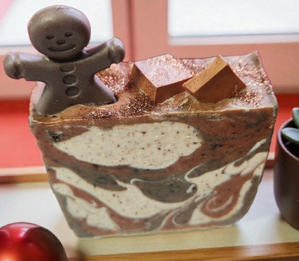 The top features adorable gingerbread and caramel melt & pour embeds, finished with a sprinkle of biodegradable glitter for a festive sparkle.